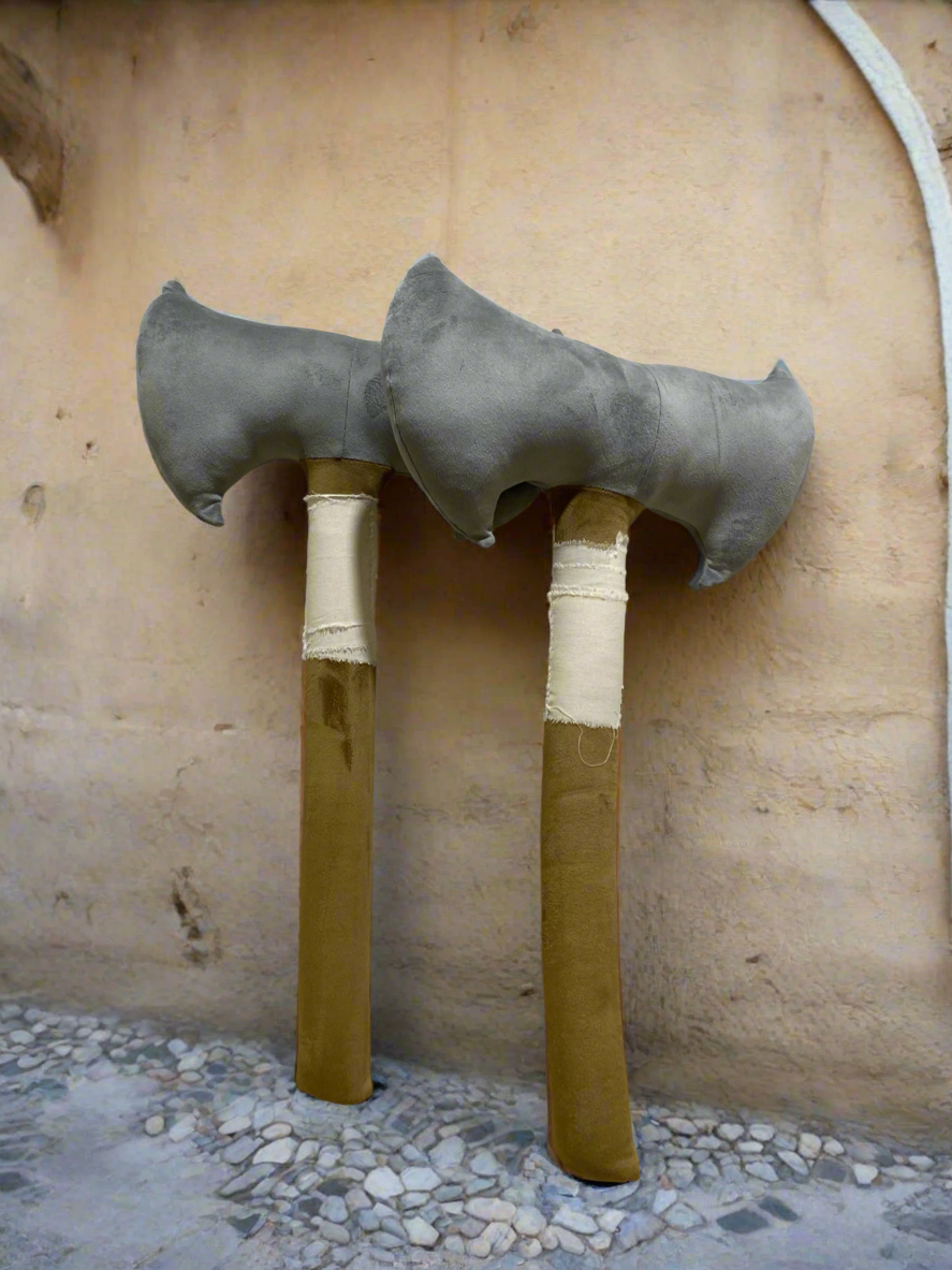 Hacha de doble filo de peluche, rellena de esponja de poliuretano y estructura rígida. Relleno de la hoja 100% polyester.